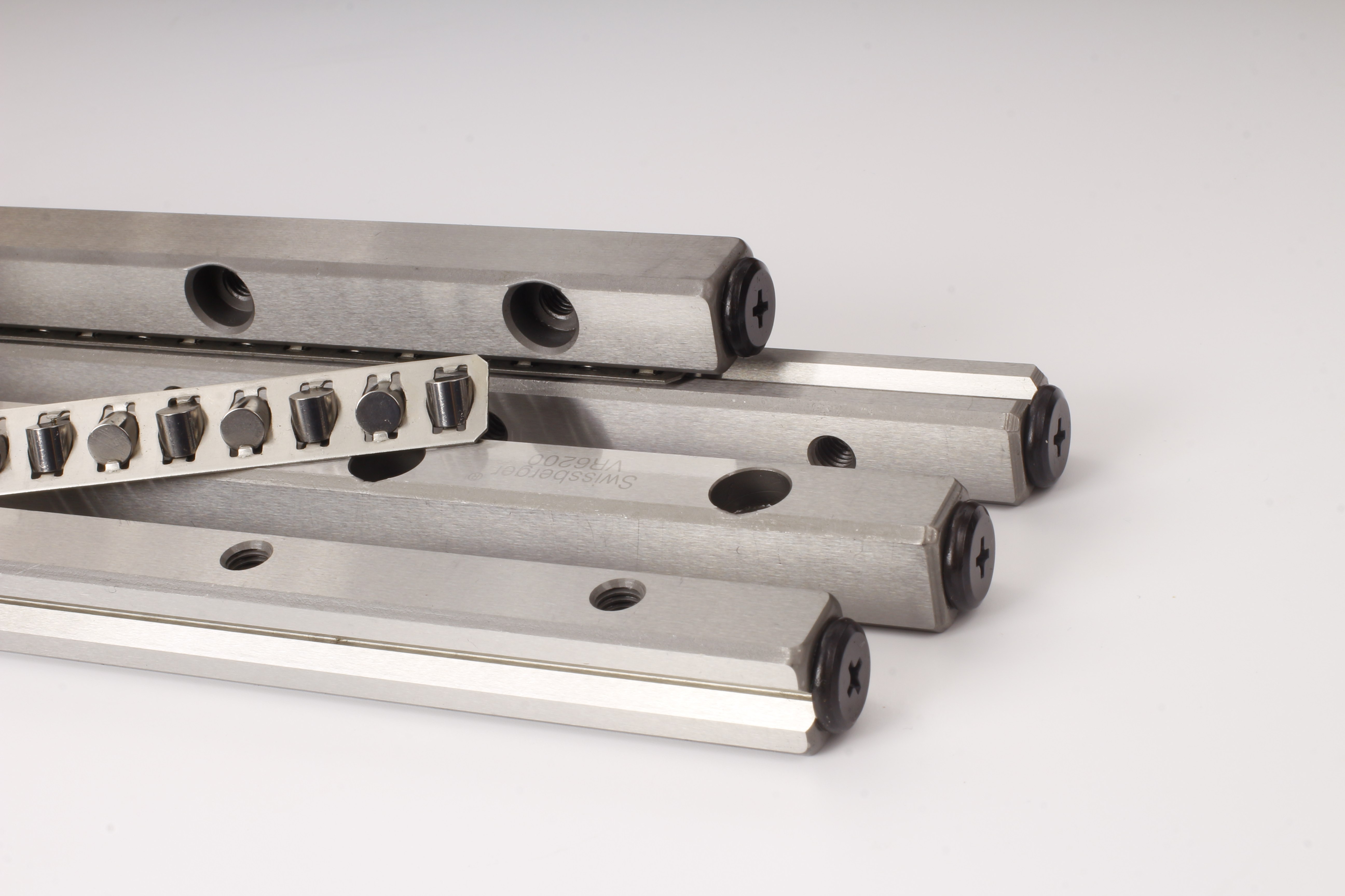 精密交叉导轨属有限行程型导向部件,结构由两根精密磨削的V型滚道导轨、交叉排列的圆柱滚子及专用保持架构成。滚子以90度正交方式密集分布,通过保持架精准定位形成稳定运动单元,相较于传统直线导轨,无需双轨平行布置即可实现更优导向效果,大幅节省安装空间。V型滚道经精密磨削处理,表面光洁度与尺寸精度达微米级,为滚子运动提供均匀接触基础。