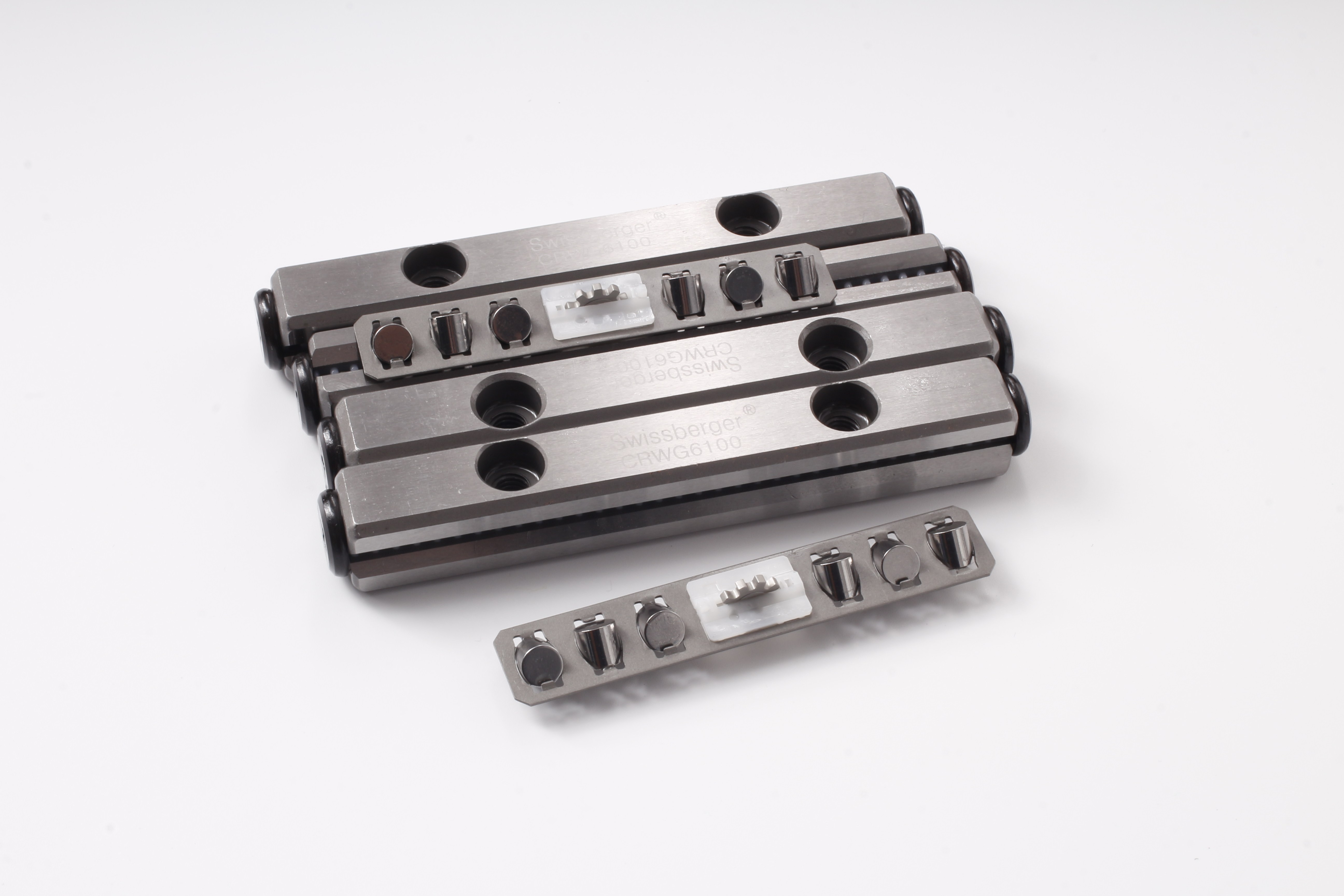 交叉导轨的重要部件在于其V型沟槽与交叉排列的圆柱滚子。它的导轨上均加工有经过精密研磨的90°V形滚道。而其中的滚子,以相邻两个呈90°角的方式交叉排列在滚道中。这种设计的精妙之处在于: