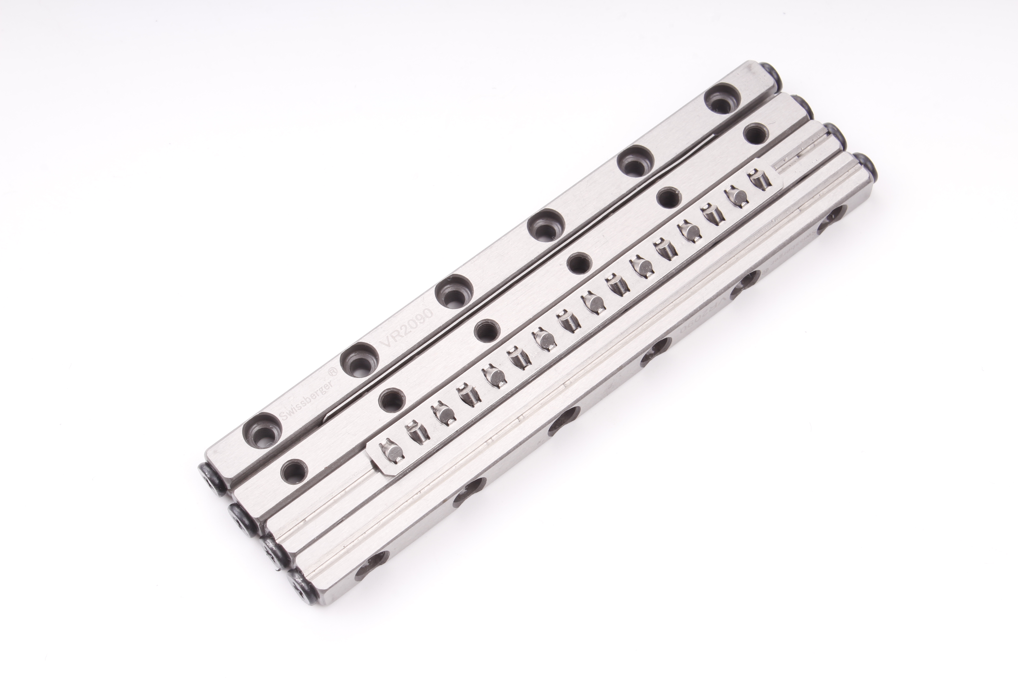滚柱型交叉导轨的重要结构由两根带V型滚道的导轨、滚子保持架及圆柱滚子组成。其标志性设计在于滚柱呈交叉正交排列,通过保持架有序分隔,在精密磨削的V型滚道面上形成线接触滚动运动。与传统滚珠导轨的点接触不同,这种线接触设计不仅扩大了受力面积,还使导轨能同时承受径向、轴向及倾覆力矩等多方向载荷,实现无间隙的平稳运动。